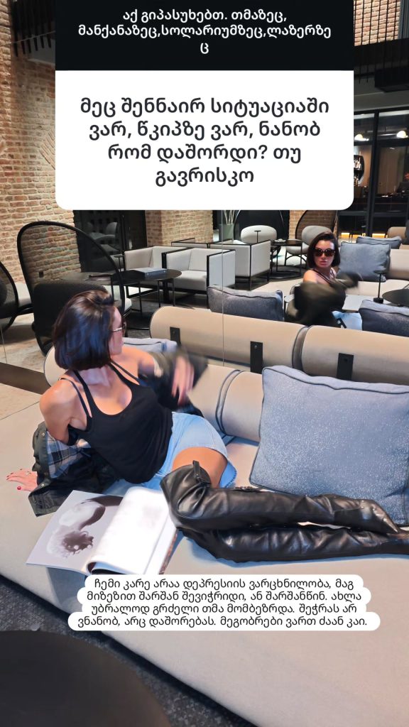 “ჩემი ყოფილი ქმარი დღემდე მშვენიერი მარტოხელა მამაკაცია. რაც შეეხება შეყვარებულს, ანუ დათოს, რომელიც ქმარი არ ყოფილა, ყოფილ ცოლს არ დაბრუნებია, არ ეგუება ჩვენს დაშორებას”.