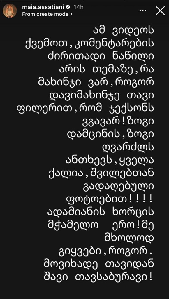“ამ ვიდეოს ქვემოთ კომენტარების ძირითადი ნაწილი არის თემაზე, რა მახინჯი ვარ, როგორ დავიმახინჯე თავი ფილერით, რომ ჯექსონს ვგავარ! ზოგი დამცინის, ზოგი ღვარძლს ანთხევს, ყველა ქალია, შვილებთან გადაღებული ფოტოებით. ადამიანის ხორცის მჭამელო ერო, მე მხოლოდ გიყვები, როგორ მოვიხადე თავიდან შავი შავი თავსაბურავი”