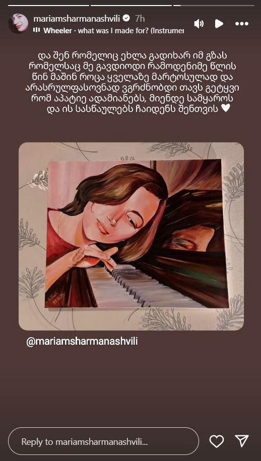 „და შენ, რომელიც ახლა გადიხარ იმ გზას, რომელსაც მე გავდიოდი რამდენიმე წლის წინ… მაშინ, როცა ყველაზე მარტოსულად და არასრულფასოვნად ვგრძნობდი თავს… გეტყვი, რომ აპატიე ადამიანებს, მიენდე სამყაროს და ის სასწაულებს ჩაიდენს შენთვის“, – წერს მარიამ შარმანაშვილი.
